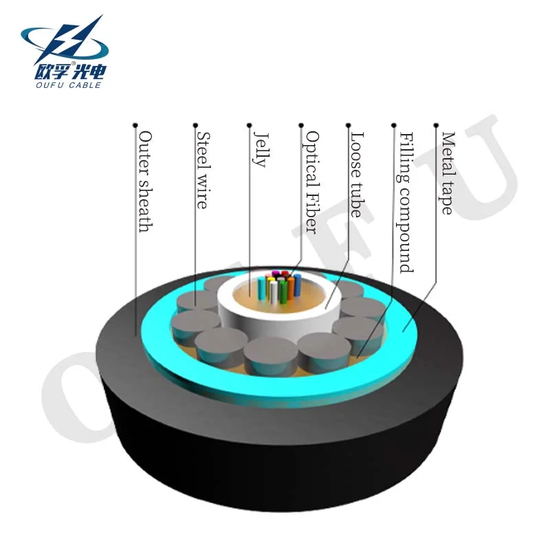 The fibers are positioned in a loose tube made of high-modulus plastic. The tubes are filled with a water-resistant filling compound. The tube is wrapped with a layer of water-blocking glass yarn. A corrugated steel tape is applied over the yarn. Two rip cords are located between the glass yan and the steel tape. Then the cable is completed with a high-density polyethylene (PE) sheath.